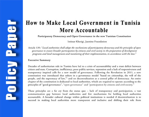 Co-Authors: Intissar Kherigi, Programmes Director, Jasmine Foundation for Research Dr. Khalil Amiri, Vice-President, Arab Governance Institute, Tunisia Abstract: Policymaking in Tunisia has traditionally been a closed process under the tight control of central government. Following the 2011 revolution, the policymaking space is opening up, with greater input by representative institutions, civil society and the public.